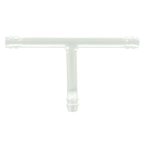 Elaborado en vidrio, forma de T, tres vías, tubo de 8 mm de diámetro exterior.