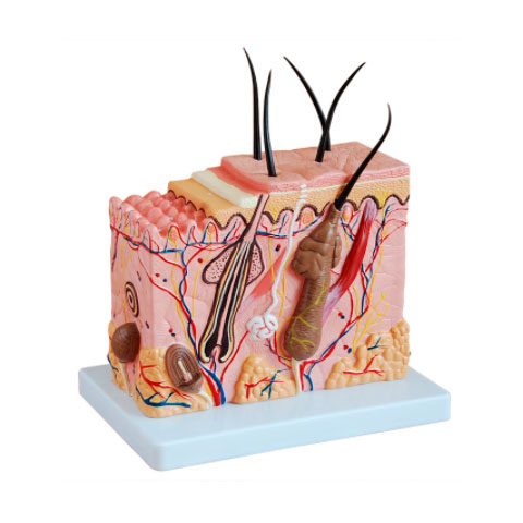 Este modelo muestra una sección de piel humana en tres formas tridimensionales. El cabello, las glándulas sebáceas y sudoríparas, los receptores, los nervios y los vasos se muestran en detalle.