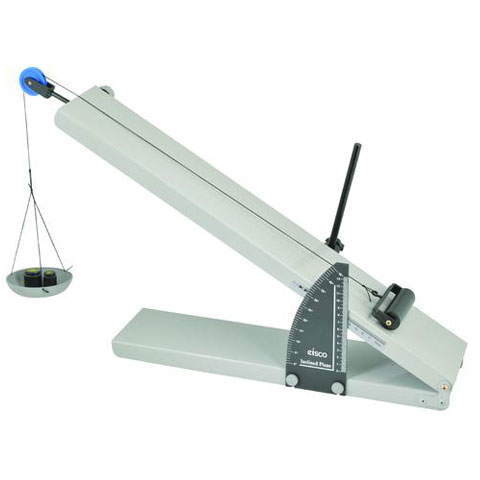 Diseñado especialmente para estudiantes. La base y el plano están conectados por una bisagra, lo que permite que el plano se sujete en cualquier ángulo de 0 a 45. El desplazamiento vertical, el desplazamiento angular y la distancia desde la bisagra se pueden medir con escalas incorporadas. La polea se puede ajustar para asegurarse de que el cable corre paralelo al plano. Dimensiones del tablero 600 x 100 mm.